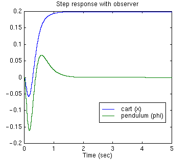 We want to place observer poles so that the observer works a lot faster than the system without the observer. Let's place the observer poles far left of above poles, say, at [-0.3 -0.31 -0.32 -0.33]. These poles can be changed later, if necessary. We will use the Matlab function place to find the L matrix. Enter the following commands to an new m-file and run it.
