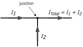 In other words the algebraic sum of ALL the currents entering and leaving a junction must be equal to zero as: \(\Sigma I_{IN} = \Sigma I_{OUT}\).