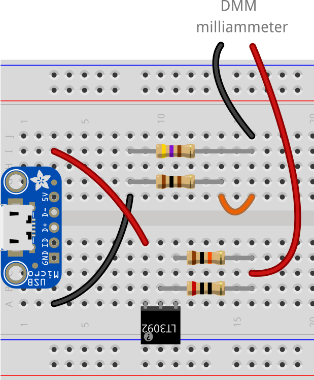 Connect the red probe of the DMM configured as a milliammeter to the Iout point in the diagram above. Connect the black probe to the GND pin of the USB Breakout board.