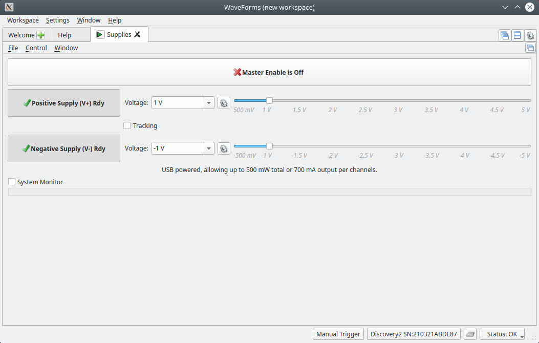 The Analog Discovery 2 is equipped with two DC power supplies: 1 positive supply and 1 negative supply.